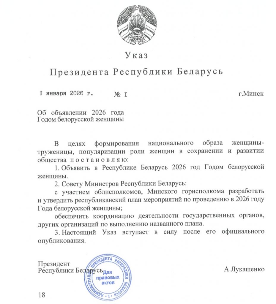 Прэзідэнт Беларусі Аляксандр Лукашэнка падпісаў Указ № 1, якім 2026 год аб’яўлены Годам беларускай жанчыны.
